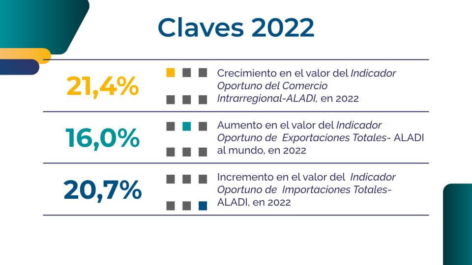 La Secretaría General de la ALADI, con el objetivo de brindar apoyo en la toma de decisiones a los actores económicos de la región, desarrolla indicadores que describen y anticipan el comportamiento del comercio intrarregional de sus países miembros desde y hacia el resto del mundo.