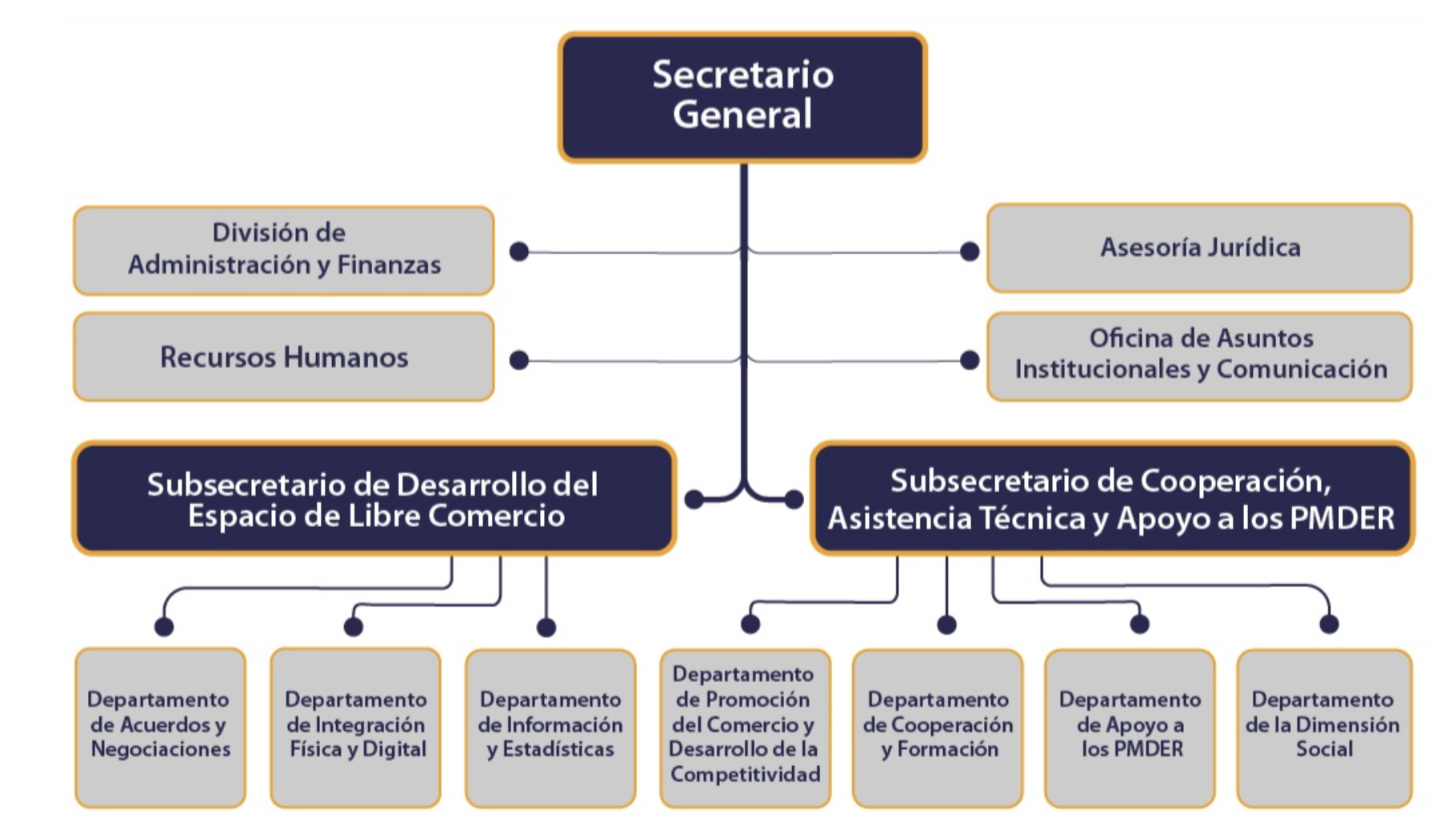 Su principal autoridad es el Secretario General, quien cuenta con el apoyo de dos Secretarios Generales Adjuntos: Subsecretario de Desarrollo del Espacio de Libre Comercio, y Subsecretario de Cooperación, Asistencia Técnica y Apoyo a los PMDER; todos electos por un período de tres años, renovable por igual término.