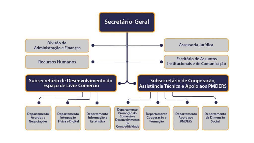 Sua autoridade principal é o Secretário-Geral, que conta com o apoio de dois Secretários-Gerais Adjuntos: o Subsecretário de Desenvolvimento do Espaço de Livre Comércio e o Subsecretário de Cooperação, Assistência Técnica e Apoio aos PMDER, todos eleitos por um período de três anos, renovável por igual período.